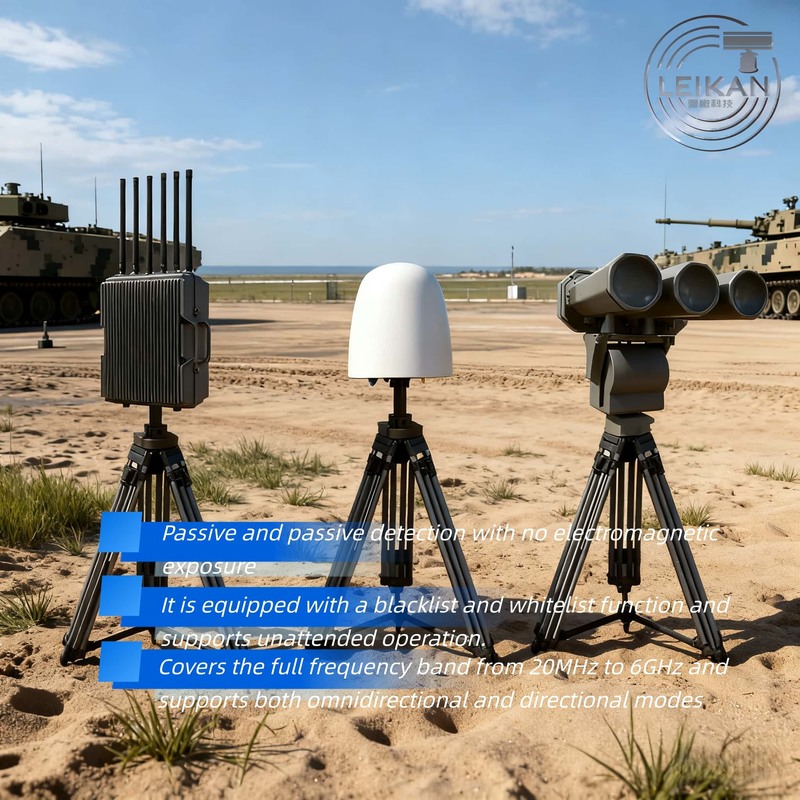 - Detecção Passiva em Todas as Direções: Apenas recebe passivamente (sem transmissão de sinal eletromagnético) e detecta os sinais espontâneos de drones, permitindo a identificação da marca, modelo e frequência de drones não autorizados. Não afetado por chuva, neve ou neblina, suporta detecção 24 horas por dia, 7 dias por semana, em todas as condições climáticas e 360°, cobrindo mais de 95% dos drones disponíveis no mercado.